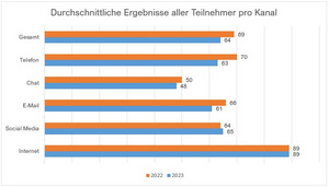 Um etwas konkreter zu werden: die stärksten Kategorien waren „Hosting-Dienstleister“ und „Versandhandel“ mit jeweils 75 Prozentpunkten, die Sieger der Kategorien waren Weltbild und IONOS, sie hatten es allerdings schwer, da die direkten Konkurrenz-Unternehmen auch sehr stark waren. Am Ende haben beide Unternehmen jedoch mit gutem Abstand den Sieg in ihrer Kategorie geholt. Das Ergebnis des ersten Platzes ist tatsächlich das beste Gesamtergebnis, das wir im Wettbewerb bisher hatten. Das Unternehmen dahinter ist Michelin. Michelin hat zum dritten Mal teilgenommen und seine Leistung über die Jahre konstant verbessert. Es war auch das einzige Unternehmen, das sowohl dieses als auch letztes Jahr, in der Gesamtwertung über 80 Prozentpunkte kam – das ist wirklich grandios, da so gut wie niemand die 90 schafft. Was die Kanäle angeht, so war Chat dieses Jahr der schwächste Kanal. Hier gab es wenige sehr starke Unternehmen, eines davon ist Neato Robotics, das hier den ersten Platz erreicht hat.